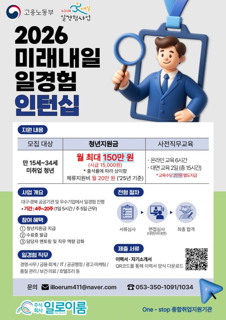 고용노동부와 (주)일로이룸이 함께하는「2026 미래내일 일경험 인턴십」사업을 안내드립니다.